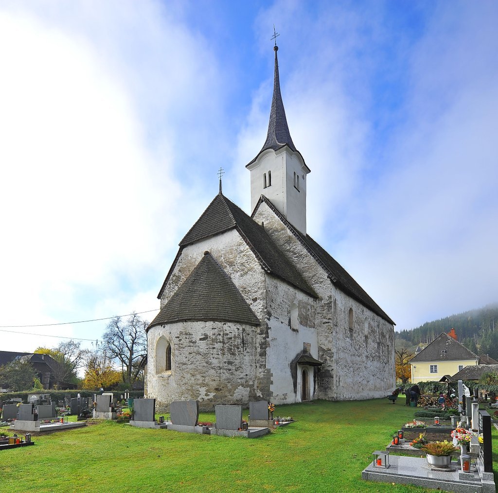Ostnordost-Ansicht der Pfarrkirche heiliger Egydius inmitten des Friedhofs