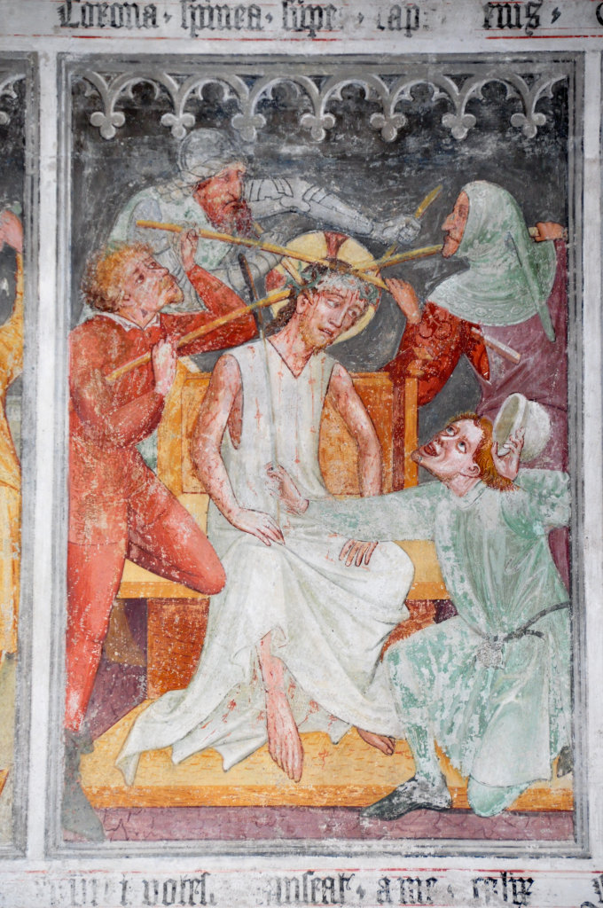 Dornenkroenung (Fresko von Thomas von Villach aus dem Jahr 1527) an der Nord-Wand der Pfarrkirche Heiliger Andreas.