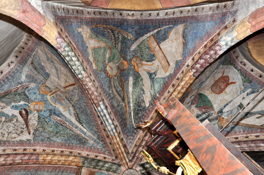 Engel mit Hackbrett und Tamburin (Fresko von Thomas von Villach aus dem Jahr 1527) im Chorschluss der Pfarrkirche Heiliger Andreas.