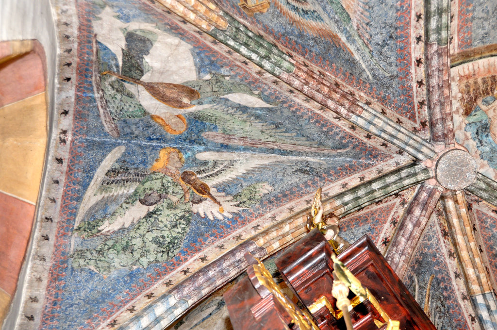 Engel mit Laute und Fiedel (Fresko von Thomas von Villach aus dem Jahr 1527) im Chorschluss der Pfarrkirche Heiliger Andreas.