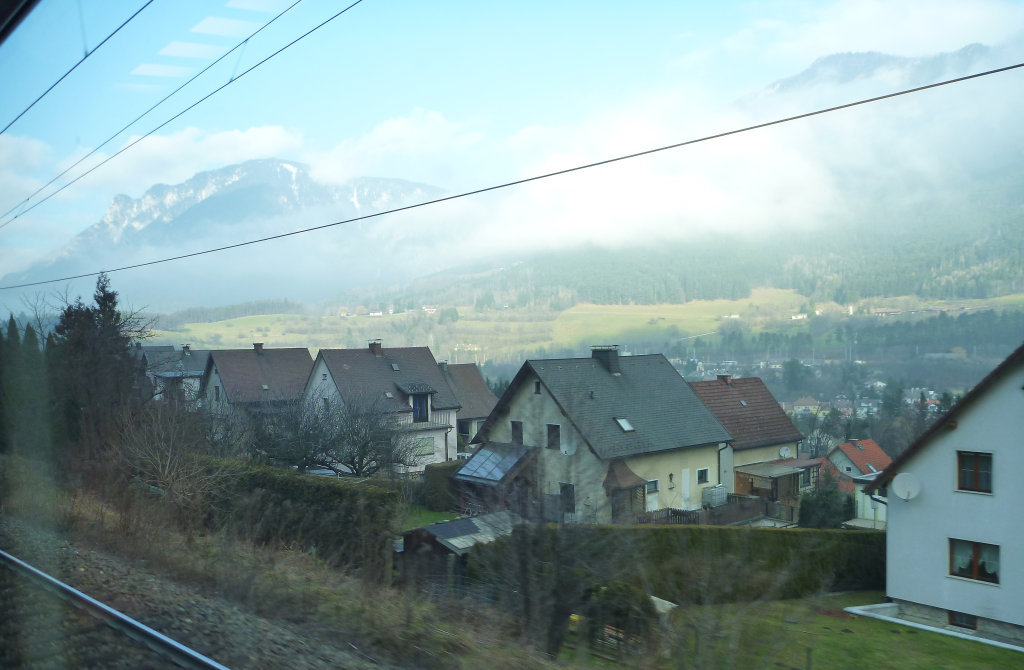 Weinwegsiedlung in Payerbach - Foto aus dem fahrenden Zug.