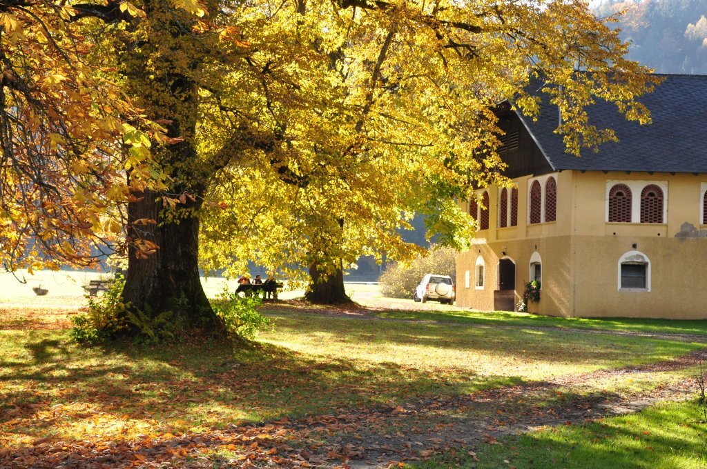 Herbststimmung unter Linden am Wirtschaftsgebäude - Spitzwiesen, Kärnten (9571-KTN)